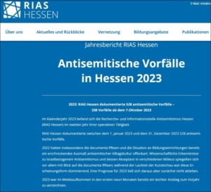 Am 22. Mai hat die am Demokratiezentrum Hessen angegliederte Recherche- und Informationsstelle Antisemitismus Hessen (RIAS Hessen) ihren Jahresbericht 2023 mit den registrierten Vorfallsmeldungen für das vorige Jahr mit erschreckenden Zahlen veröffentlicht.
