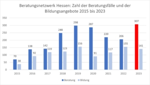 Kernstück des 76 Seiten umfassenden Berichts ist eine detaillierte statistische Auswertungsübersicht der Beratungsfälle und der Bildungs- bzw. Präventionsmaßnahmen des vergangenen Jahres. Danach wurde 2023 mit 307 Fällen die höchste Zahl neuer Beratungen seit Bestehen des Beratungsnetzwerks erreicht. Das ist eine Steigerung von 49 % im Vergleich zum Vorjahr (2022: 206 Fälle). Und trotz der erhöhten Beratungszahlen konnte 2023 auch die Anzahl an Bildungsangeboten mit 148 durchgeführten Bildungs- und Präventionsveranstaltungen in etwa gleich hoch gehalten werden.