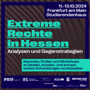 25.9.2024 Vom 11. bis 13. Oktober 2024 findet eine Konferenz mit dem Titel „Extreme Rechte in Hessen: Analysen und Gegenstrategien“ im Studierendenhaus am Campus Bockenheim in Frankfurt/M. statt.