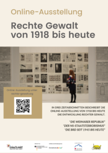 Die empfehlenswerte Online-Ausstellung beschreibt die Entwicklung rechtsextremer Gewalt von 1918 bis heute und die mit ihr verbundenen Verbrechen. Sie zeigt deren Kontinuität und Hintergründe und damit zugleich die Wurzeln heutiger Hetze und Gewalttaten. Sie soll dabei helfen, Gefahren rechtzeitig zu erkennen und rechter Agitation mit Fakten und Argumenten zu begegnen.