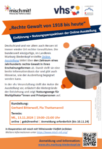 Hinweis: Am Mittwoch, 13. November 2024, von 19 bis 21 Uhr findet in Kooperation mit der VHS Marburg-Biedenkopf eine Online-Veranstaltung für Multiplikator*innen und Interessierte statt, in welcher der Mitautor die Ausstellung vorstellt, die Entstehungshintergründe erläutert und Nutzungswege aufzeigt. Mehr Informationen zu dieser Veranstaltung und zur Anmeldung unter https://www.misch-mit.org/news und https://www.vhs-marburg-biedenkopf.de/programm/kurs/Die-Online-Ausstellung-Rechte-Gewalt-von-1918-bis-heute-Einfuehrung-und-Persp/AQ101011ZM#inhalt